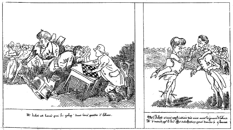 | Après quoi Mr Jabot se remet en position. | Mr. Jabot croit devoir parier à une table d'écarts où joue le Baron de la Canardière. | Au 4ième retour du galop, Mr. Jabot croit devoir s'effacer au grand détriment du Baron et de sa partie. |