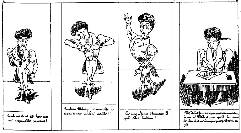 | Combien il a été heureux en impayables réparties. | Combien Milady fut aimable et son tendre intérêt visible!!! | Et cinq affaires d'honneur!!! quel début brillant! | Mr. Jabot fais ses dispositions testamentaires, écrit à Milord pour qu'il lui serve de second, et au chirurgien pour qu'il se trouve prêt. |