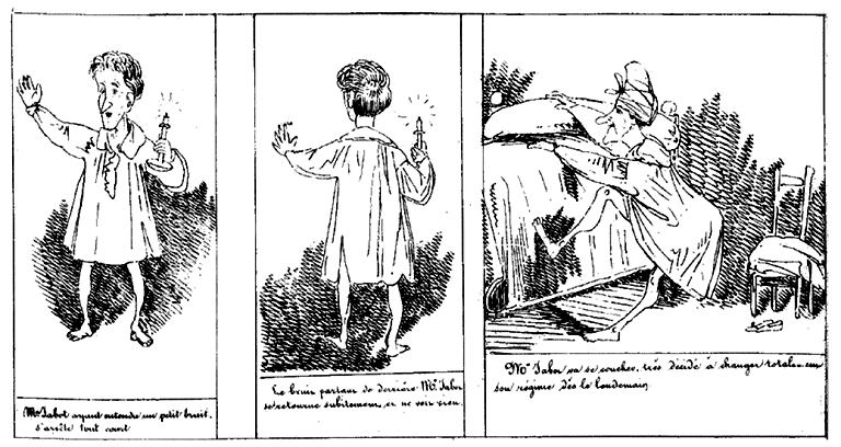 | Mr. Jabot a mal au coeur. | Et même une faiblesse. Ayant posé la main sur l'oreille du chien de la Marquise, il se félicite d'avoir retrouvé son amadou qu'il a laissé égarer la veille. | Se croyant toujours dans sa chambre, Mr. Jabot va prendre à la table de nuit de quoi avoir de la lumière. Il trouve un morceau de caramel et un flacon de pommade pour les lèvres. |