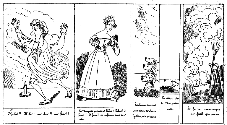 | Entendant parler de flamme amoureuse, la Marquise de Mirliflor juge qu'elle pourrait bien y être pour quelque chose. | Ayant senti la chaleur au dos, Mr. Jabot fait neuf fois le tour de sa chambre en criant: Je brûle!... je brûle!!! | La Marquise ne doute plus qu'elle n'ait plus inspiré une passion d'une violence extraordinaire. |