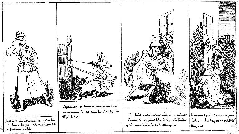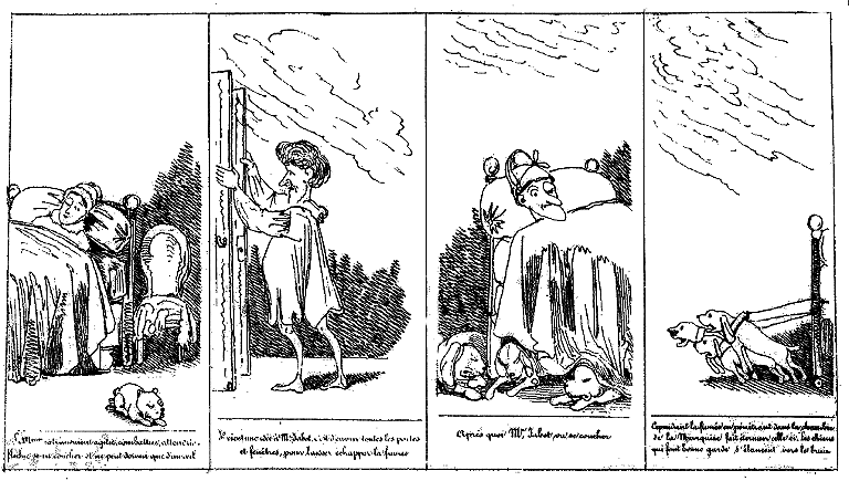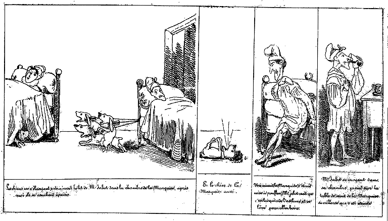 | Les chiens, en s'élançant, entraînent le lit de Mr. Jabot dans la chambre de le Marquise. Après quoi ils se couchent épuisés. | Et le chien de la Marquise aussi. | Vers minuit, la Marquise s'étant mise à ronfler Mr. Jabot croit que c'est lui qui a de l'asthme, et se lève pour aller boire. | Mr. Jabot se croyant dans sa chambre, prend sur la table de nuit de la Marquise sa veilleuse qui s'est éteinte. |