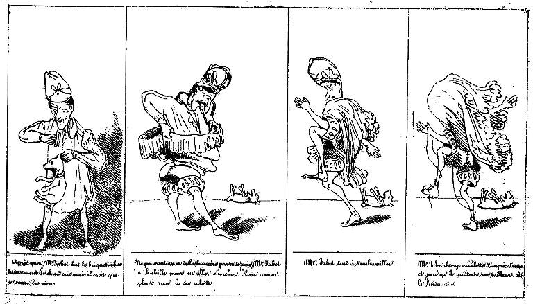 | Les propos étant peu goûtés, Mr. Jabot croit devoir approprier des gestes de bon goût à ses expressions choisies. | Les expressions ayant peu d'effet, Mr Jabot croit devoir se renfermer dans une attitude décélant l'observation fine et la plaisanterie de bon ton. | Après quoi, Mr Jabot conduit la galope avec le plus heureux succès. |