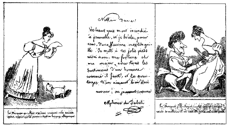 Noble Dame! Vos beaux yeux m'ont incendié la prunelle, et je brûle, pour vous, d'une flamme inextinguible. Je mets à vos jolis pieds mon nom, ma fortune et ma main, avec tous les sentimens d'un homme comme il faut, et les avantages d'un amant bien élevé. Un oui! ou je meurs consumé. Alphonse de Jabot. |