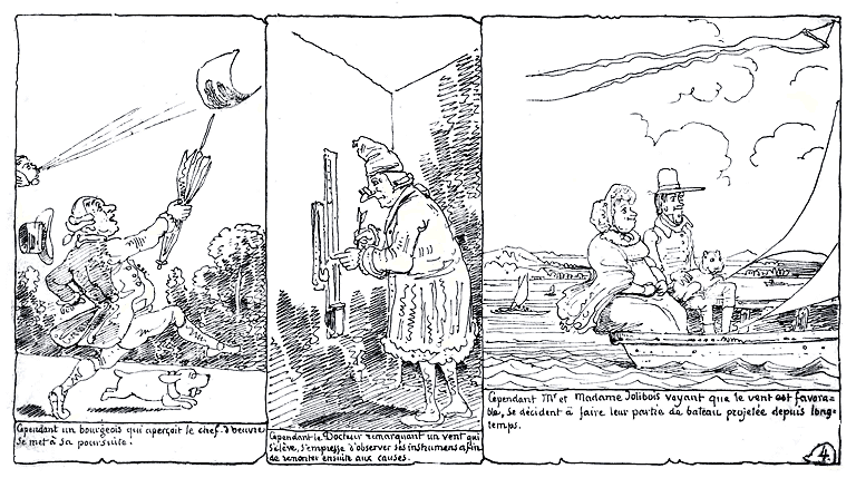 | En ayant assez du dessin, le petit zéphir passe au Bourgeois, et s'amuse à ouvrir son parapluie! | Puis il souffle d'en bas, ferme. | Ayant senti du froid, le Docteur se rhabille, et s'en va rédiger sa découverte d'un vent souterrain tout nouveau. | Par suite du vent souterrain, Mr. et Madame Jolibois commencent à être dans un sérieux embarras |