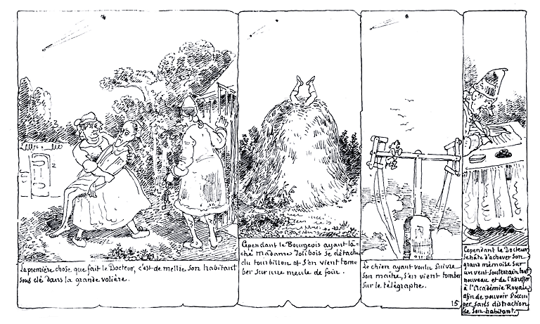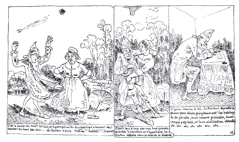 | C'est le soulier de Made. Jolibois et le parapluie du bourgeois qui viennent de tomber du haut des airs.... Le Docteur s'écrie: Habitée!! habitée!!!! (la planète). | Assailli tout à coup par une trop grande quantité d'inductions et d'hypothèses, le Docteur défaille dans les bras de sa servante. | A peine revenu à lui, le Docteur reprend la plume pour décrire précipitamment les habitants de sa planète, leurs moeurs probables, leurs usages possibles, et leur civilisation virtuelle etc. etc. etc. etc. etc. etc. etc...... |