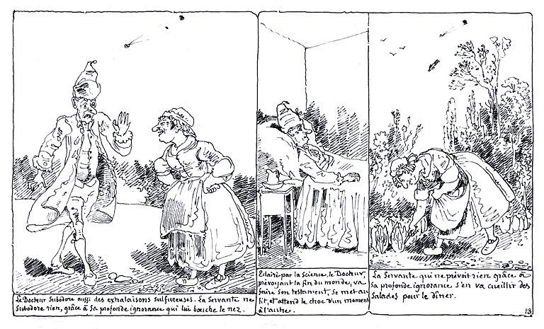 | Le Docteur subodore aussi des exhalaisons sulfureuse. Sa servante ne subodore rien, grâce à sa profonde ignorance qui lui bouche le nez. | Eclairé par la science, le Docteur prévoyant la fin du monde, va faire son testament, se met au lit, et attend le choc d'un moment à l'autre. | Sa servante qui ne prévoit rien grâce à sa profonde ignorance s'en va cueillir des salades pour le dîner. |