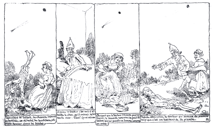 | Cependant Mr. Jolibois, sa chemise s'étant entortillée, est détaché du tourbillon, et vient tomber dans les salades. | A peine le Docteur s'est mis à attendre le choc, qu'il entend sa servante crier: Tiens! quel oiseau! | Pendant que le Docteur s'habille pour accourir, la servante retourne du pied Mr. Jolibois qui lui paraît un homme comme un autre. | Profonde admiration du Docteur qui découvre du premier coup que c'est un habitant de sa planète. |