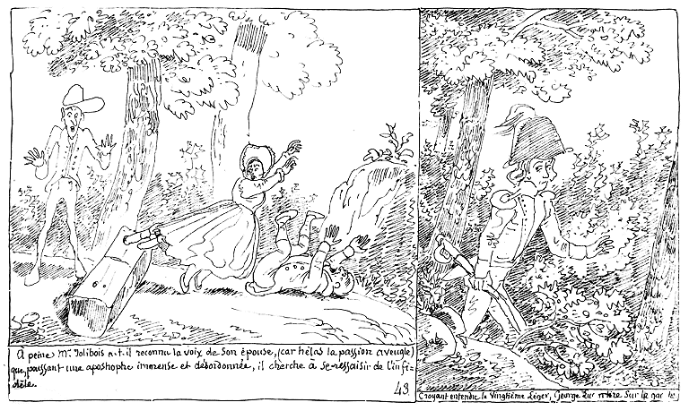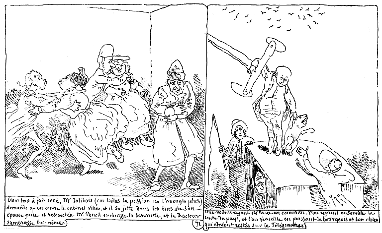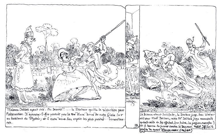 | Madame Jolibois ayant crié: Au secours!!.... le Docteur quitte la rédaction pour l'observation. Il examine l'effet produit par la vue d'une dame de notre globe sur un habitant de Psyché; et il note dans son esprit les plus petites circonstances. | Le Docteur rédige. | La Science étant satisfaite, le Docteur juge bon d'aller délivrer Mde. Jolibois; mais Mr. Jolibois juge mauvais qu'on se mêle de ses affaires, (car hélas la passion aveugle) et il tourne sa fureur contre le Docteur. Made. Jolibois profite du quart d'heure pour s'enfuir. |