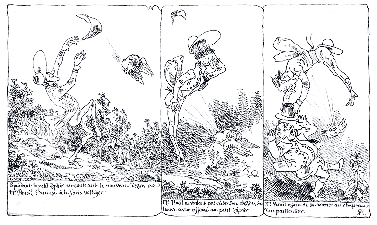 | Cependant le petit zéphir rencontrant le nouveau dessin de Mr. Pencil s'amuse à le faire voltiger. | Mr. Pencil ne voulant pas céder son dessin, se trouve avoir affaire au petit zéphir. | Mr. Pencil essaie de se retenir au chapeau d'un particulier. |