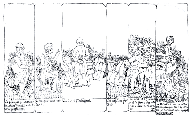 le tonneau: "Mes bons amis, si vous avez faim, prenez-vous en à votre gouvernement. Avait-on faim avant quatre-vingt neuf? Non. Avait-on faim sous la restauration? Non. Avons-nous faim nous qui sommes restés fidèles? Pas le moins du monde!" |