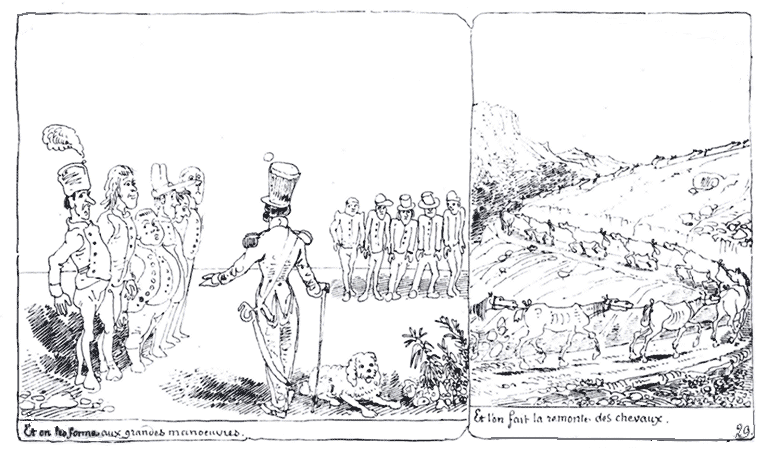 | Le Vingtième-léger ouvre les écluses pour inonder les lieux bas à cause des voleurs. | Le vingtième léger brûle un bois pour incendier les lieux hauts, à cause des voleurs. | Après quoi, le vingtième léger ayant chaud se fait rafraîchir par le maire. |