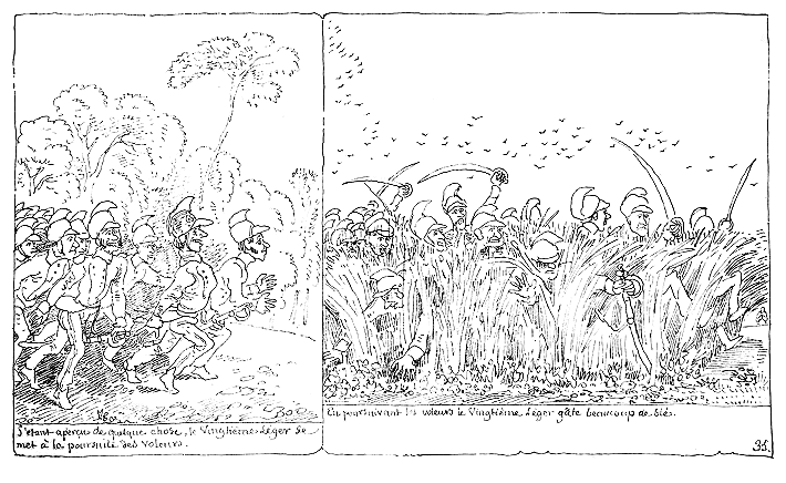 | S'étant aperçu de quelque chose, le Vingtième-léger se met à la poursuite des voleurs. | En poursuivant les voleurs le Vingtième-léger gâte beaucoup de blé. |