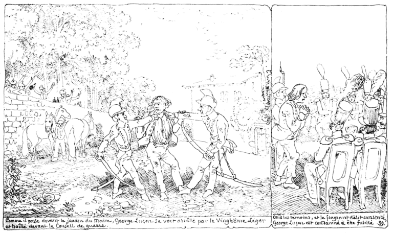 | Comme il passe devant le jardin du maire, George Luçon se voit arrêté par le Vingtième-léger et traîné devant le conseil de guerre. | Ouïs les témoins, et le flagrant délit constaté, George Luçon est condamné à être fusillé. |