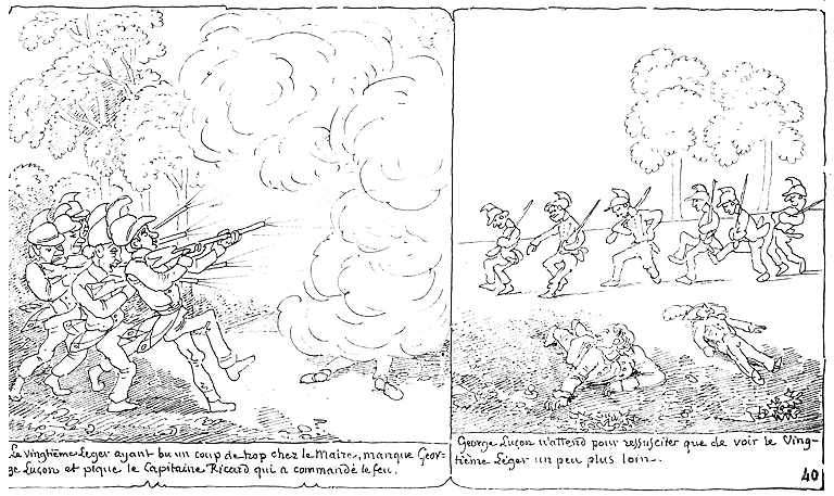| Le Vingtième-léger ayant bu un coup de trop chez le maire, manque George Luçon et pique le Capitaine Ricard qui a commandé le feu. | George Luçon n'attend pour ressusciter que de voir le Vingtième-léger un peu plus loin. |