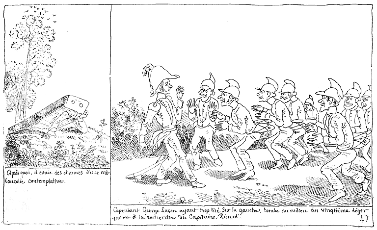 | Après quoi il essaie des charmes d'une mélancolie contemplative. | Cependant George Luçon ayant tiré trop sur la gauche, tombe au milieu du Vingtième-léger qui est à la recherche du Capitaine Ricard. |