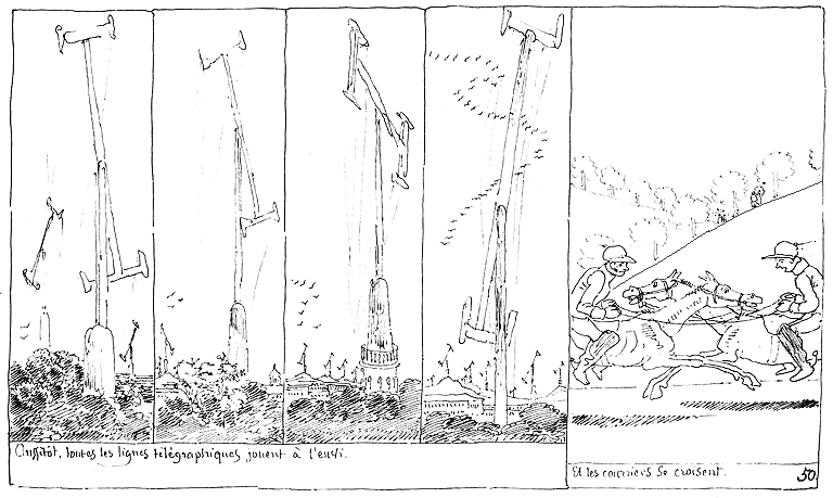| Les phioles s'étant cassées au milieu du désordre, les trois savants tombent asphyxiés. | Cependant le chien du bourgeois en cherchant à se tirer d'affaire fait légèrement basculer le télégraphe. | Aussitôt toutes les lignes télégraphiques basculent légèrement. |