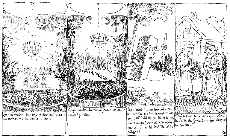 | Les uns veulent le couplet sur la Pologne, les autres ne le veulent pas. | Ce qui amène la manifestation de l'esprit public. | Cependant la mélancolie contemplative ne lui faisant aucun bien, Mr. Jolibois (car hélas la passion aveugle) erre à la rencontre d'un mortel sensible et compatissant. | D'où le bruit se répand que c'est la Bête du Gévaudan qui dévaste la contrée. |