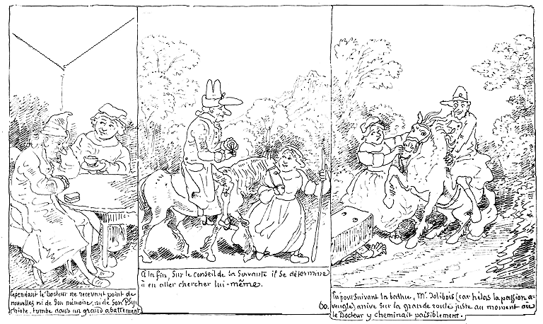 | Le Docteur ayant reconnu son Psychiote en personne, descend précipitamment de cheval pour le prendre et le mettre en croupe. | Mr. Jolibois ayant reconnu son Docteur (car hélas la passion aveugle) rebrousse précipitamment pour lui échapper. | Et se voyant poursuivi, il résiste. |