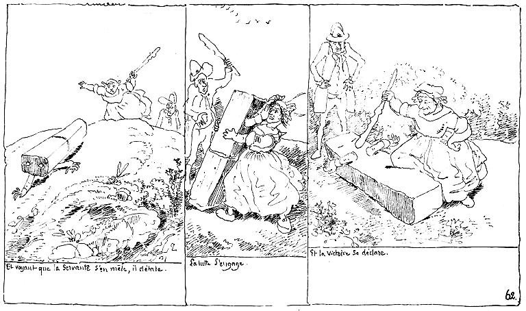 | Et voyant que la servante s'en mêle, il détale. | La lutte s'engage. | Et la victoire se déclare. |