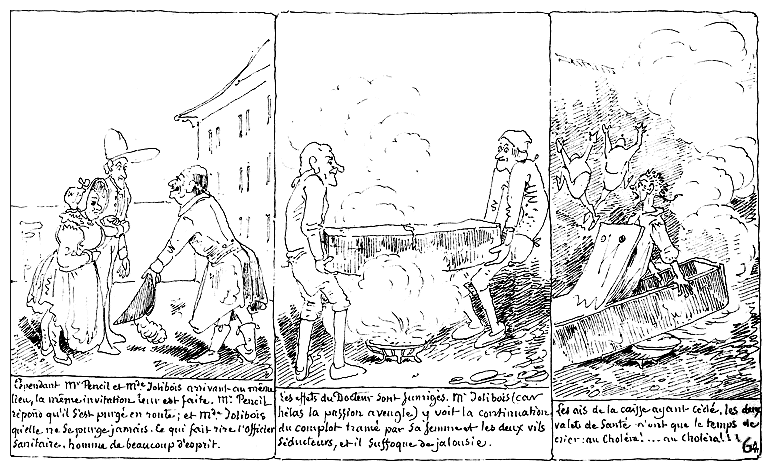| Cependant Mr. Pencil et Mde. Jolibois arrivant au même lieu, la même invitation leur est faite. Mr. Pencil répond qu'il s'est purgé en route; et Mde. Jolibois qu'elle ne se purge jamais. Ce qui fait rire l'officier sanitaire, homme de beaucoup d'esprit. | Les effets du Docteur sont fumigés. Mr. Jolibois (car hélas la passion aveugle) y voit la continuation du complot tramé par sa femme et les deux vils séducteurs, et il suffoque de jalousie. | Les ais de la caisse ayant cédé, les deux valets de santé n'ont que le temps de crier: au Choléra!... au Choléra!!! |