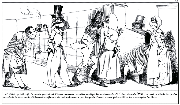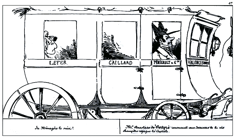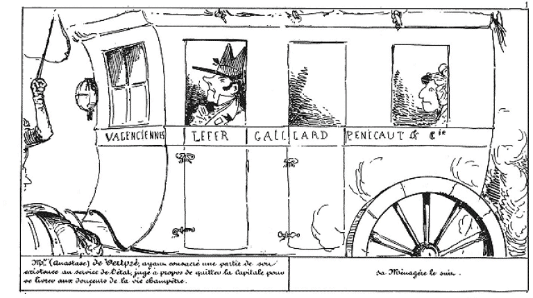| Sa ménagère le suit. | Mr. Anastase de Vertpré renonçant aux douceurs de la vie champêtre regagne la capitale. |