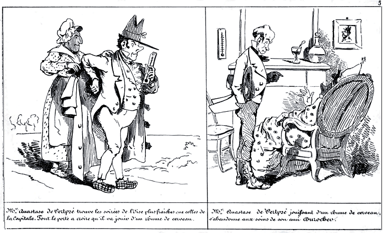 | Mr. Anastase de Vertpré trouve les soirées de l'Oise plus fraîches que celles de la capitale. Tout le porte à croire qu'il va jouir d'un rhume de cerveau. | Mr. Anastase de Vertpré jouissant d'un rhume de cerveau, s'abandonne aux soins de son ami Durocher. |
