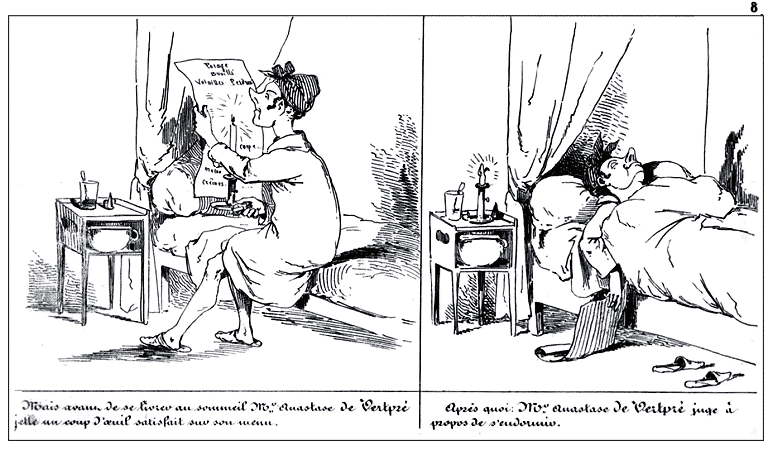 | Après quoi, Mr. Anastase de Vertpré trouve bon de s'endormir peu satisfait du passé, mais espérant beaucoup de l'avenir. | Mr. Anastase de Vertpré se réveille plein de confiance dans l'avenir, et passe son pantalon en recueillant ses idées. |
