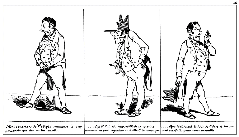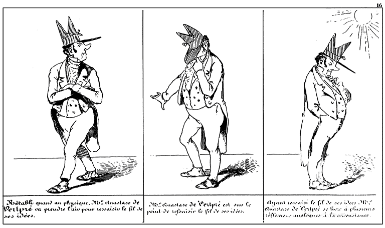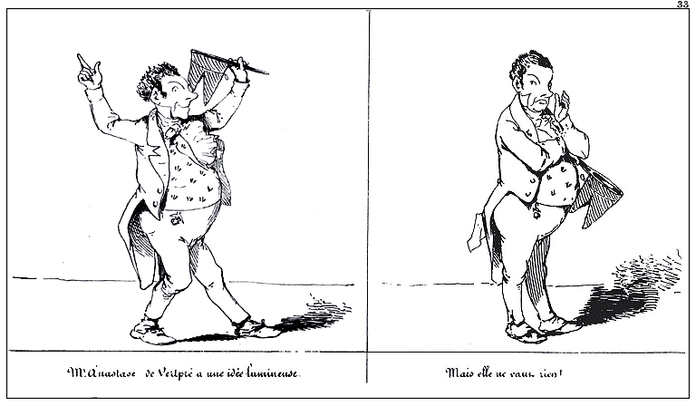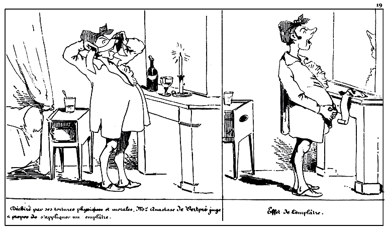 | Déchiré par ses tortures physiques et morales, Mr. Anastase de Vertpré juge à propos de s'appliquer un emplâtre. | Effet de l'emplâtre. |