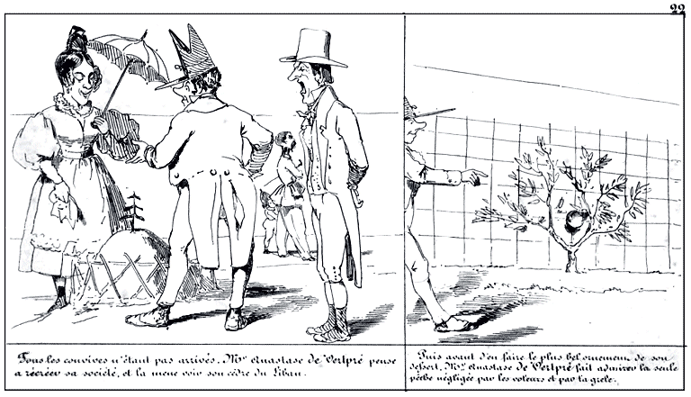 | Tous les convives n'étant pas arrivés, Mr. Anastase de Vertpré pense à récréer sa société, et la mène voir son cèdre du Liban. | Puis avant d'en faire le plus bel ornement de son dessert, Mr. Anastase de Vertpré fait admirer la seule pêche négligée par les voleurs et par la grêle. |
