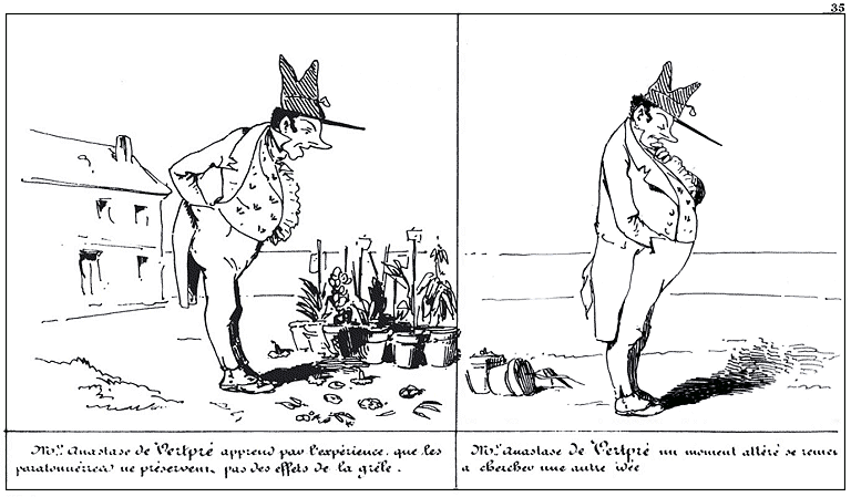 | Autre idée: fou jaloux de ses fleurs, et ayant ouï-dire que les paratonnerres préservaient de l'orage, Mr. Anastase de Vertpré procède à en établir sur son habitation. | Après quoi Mr. Anastase de Vertpré cherche une autre idée. |