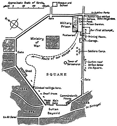 We had now reached the middle of the Seraskerat and saw that the side gate was shut, and sentry-guarded. There was also a sentry in the adjacent shed. The main gate was impossible of access. So also was the garage. Our only chance lay in going forward.